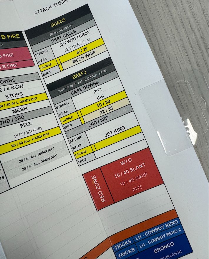 Laminated play call sheets are seen on every sideline across the country starting with middle school games, with more regularity at the JV level, and can be seen on attached to a lanyard on the neck or hip, tucked into the waistband, or simply carried around by every high school, college and NFL coordinator.