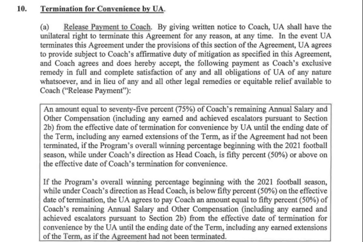 As part of an extension Pittman signed before the 2022 season, his contract dictates the buyout is dictated by Pittman's winning percentage from the 2021 campaign forward. "If the Program's overall winning percentage beginning with the 2021 football season, while under Coach's direction as Head Coach, is below 50 percent (50%) on the effective date of termination, the UA agrees to pay Coach fifty percent (50%) of Coach's annual remaining Annual Salary and Other Compensation," the contract reads.