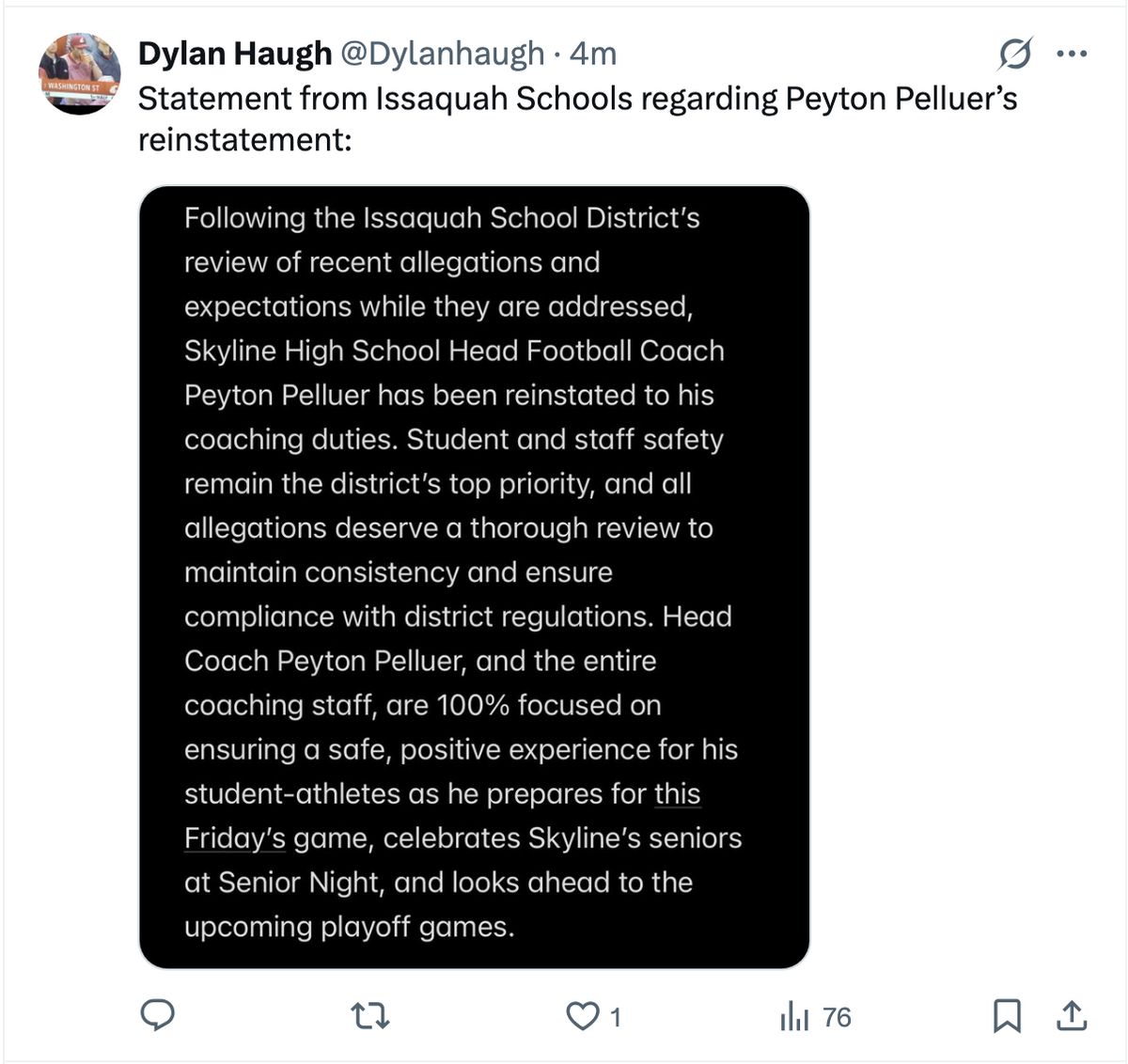 Pelluer, the second-year head coach who had the team at 4-2 prior to being handed the disciplinary action, was hit with a suspension just hours before their game Friday against Woodinville after an internal investigation was initiated by the district.