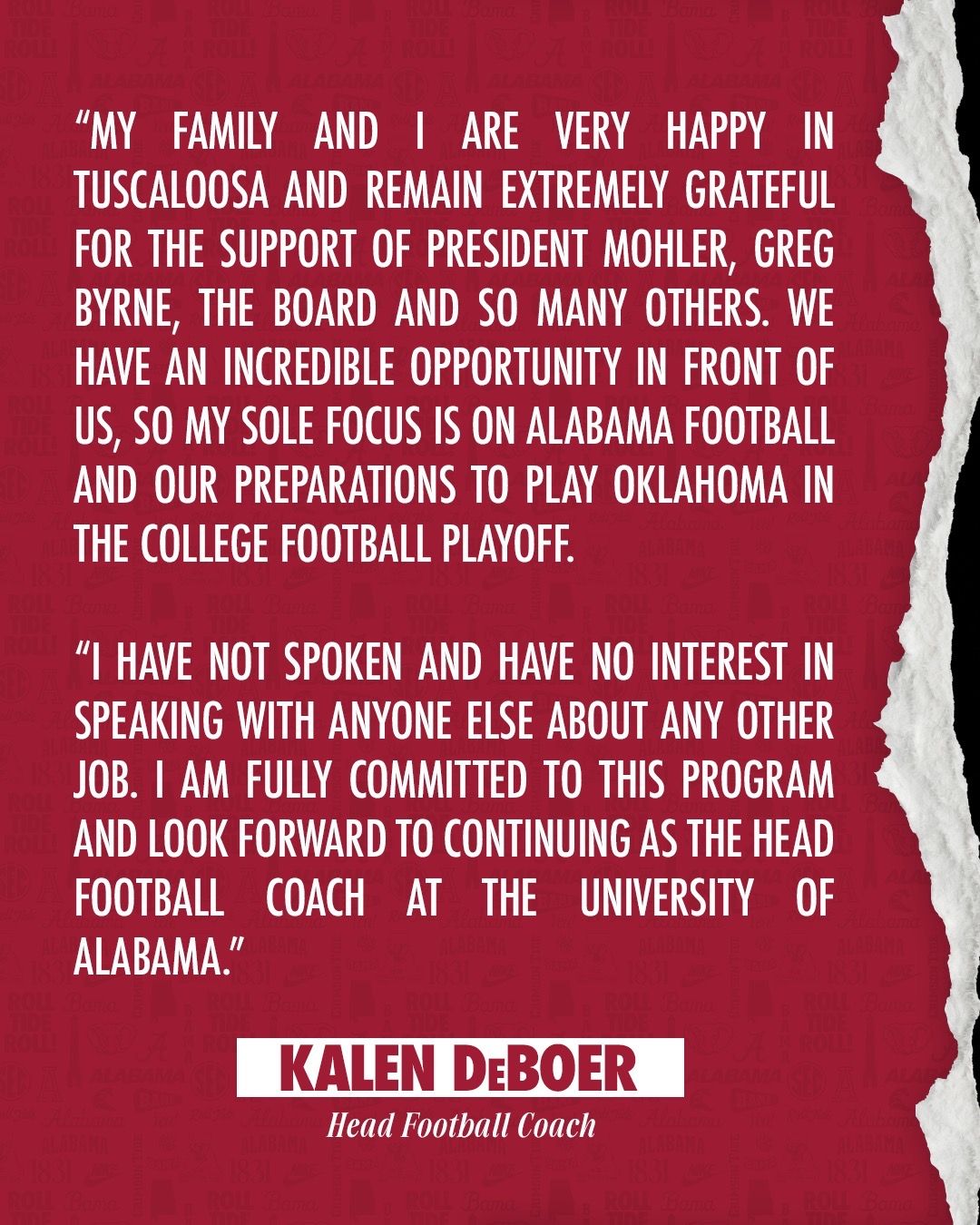 "My family and I are very happy in Tuscaloosa (Alabama) and remain extremely grateful for the support of President (Dr. Peter J.) Mohler, (athletics director) Greg Byrne, the Board (of Trustees) and so many others. We have an incredible opportunity in front of us, so my sole focus is on Alabama football and our preparations to play Oklahoma in the College Football Playoff."