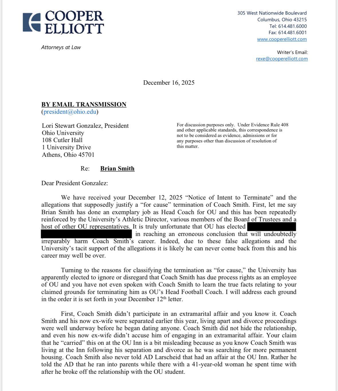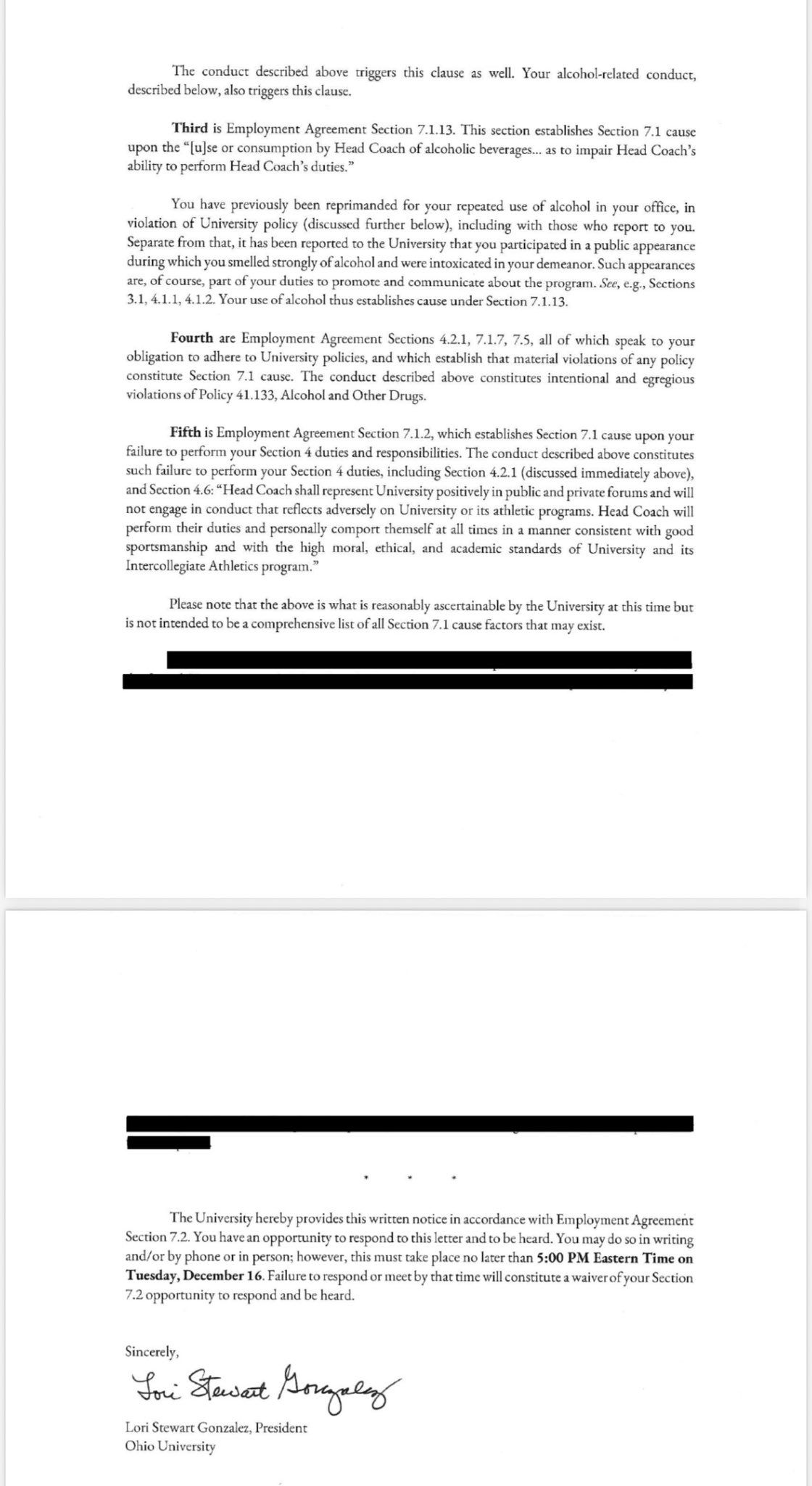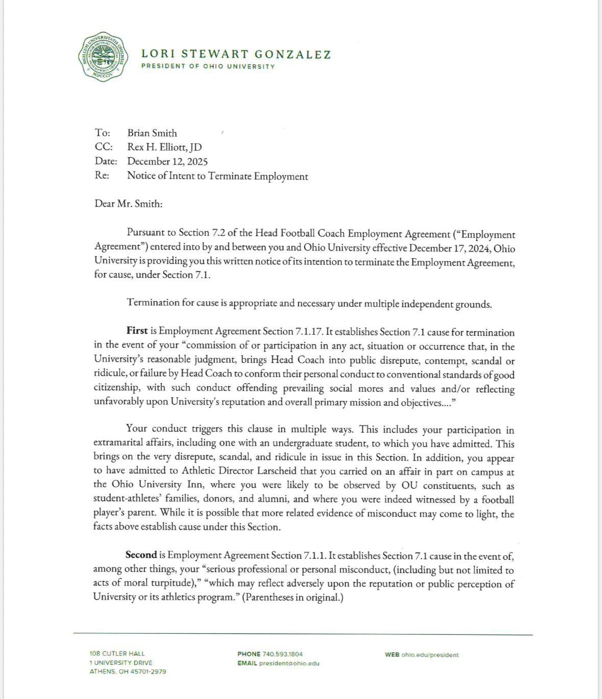 First, Ohio President Lori Stewart Gonzalez's letter outlines the school's perspective where she lays out specific instances of the Employment Agreement that states cause for termination in the event of "commission of or participation in any act, situation or occurrence that, in the University's reasonable judgement, brings Head Coach into public disrepute, contempt, scandal or ridicule or failure by Head Coach to conform their personal conduct to conventional standards of good citizenship, with such conduct offending previaling social mores and values and/or reflecting unfavorably upon University's reputation and overall primary mission and objectives."