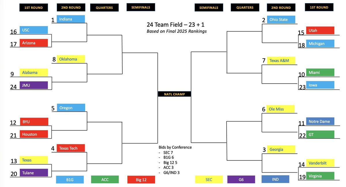 A: Good question, me. In FCS and beyond, the NCAA gives automatic qualifiers to every conference champion. That would not be the case here. Per Pete Thamel: "The 24-team format would comprise the 23 best teams and one spot for the Group of 6." The SEC would have gotten seven teams in a 24-team CFP in 2024, the Big Ten six, the Big 12 five, the ACC three, the Group of 6 two, and Notre Dame.