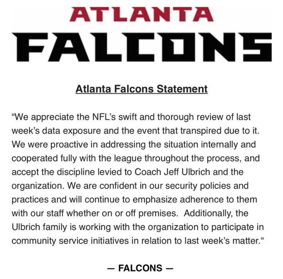 As an organization, the Falcons have been issued a fine of $250k and Jeff Ulbrich was fined $100k himself, both for “failing to prevent the disclosure of confidential information distributed to the club in advance of the NFL Draft.”