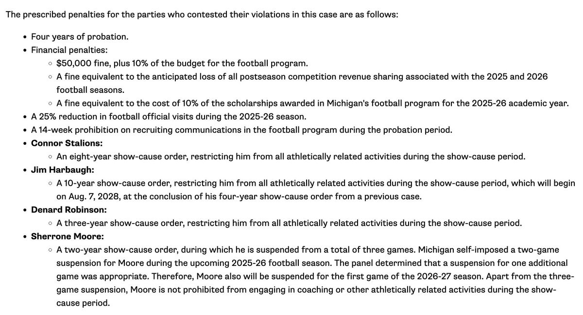 The full scope of NCAA penalties have been formally shared and include multi-year probation, significiant fines, and specifics for Stalions, Harbaugh, Denard Robinson and Sherrone Moore.