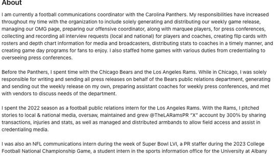 "I am currently a football communications coordinator with the Carolina Panthers. My responsibilities have increased throughout my time with the organization to include solely generating and distributing our weekly game release, managing our OMG page, preparing our offensive coordinator, along with marquee players, for press conferences, collecting and recording all interview requests (local and national) for players and coaches, creating flip cards with rosters and depth chart information for media and broadcasters, distributing stats to coaches in a timely manner, and creating game day programs for fans to enjoy. I also staffed home games with various duties from credentialing to overseeing press conferences."