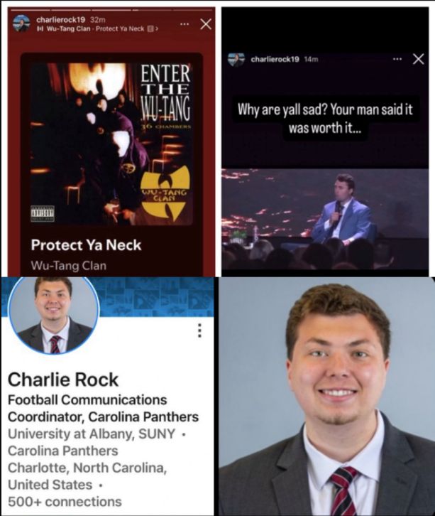 Charlie Rock, whose LinkedIn page said that Rock was a football communications coordinator for the Panthers, posted insensitive commentary regarding Kirk's death on Rock's Instagram account.