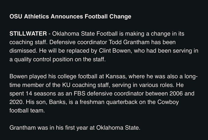 The school has shared today that defensive coordinator Todd Grantham has also been let go, just a week after the Cowboys decided to part ways with Gundy and handed the keys of the program to offensive coordinator Doug Meacham as interim head coach.