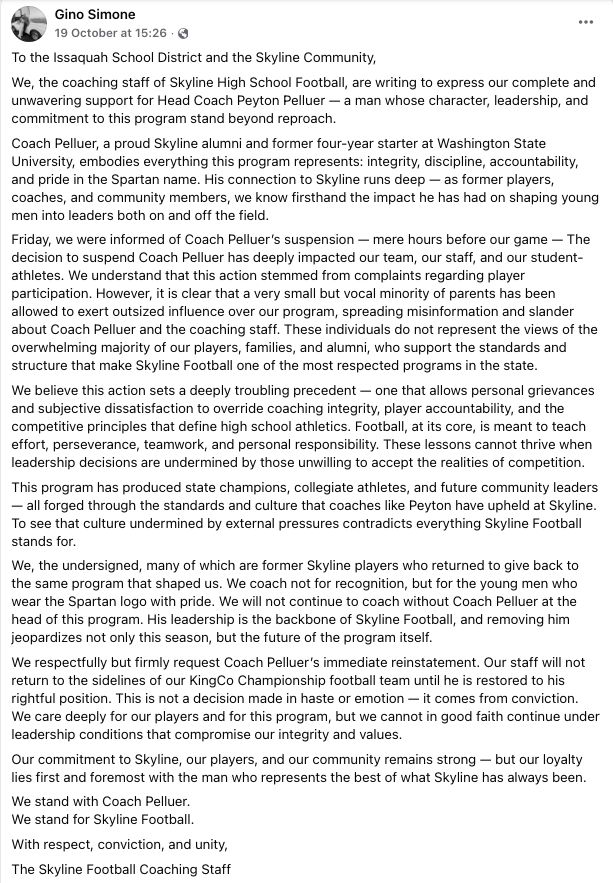 After learning of the details behind for the suspension, the Skyline coaching staff released a statement over the weekend via assistant coach Gino Simone's Facebook page.
