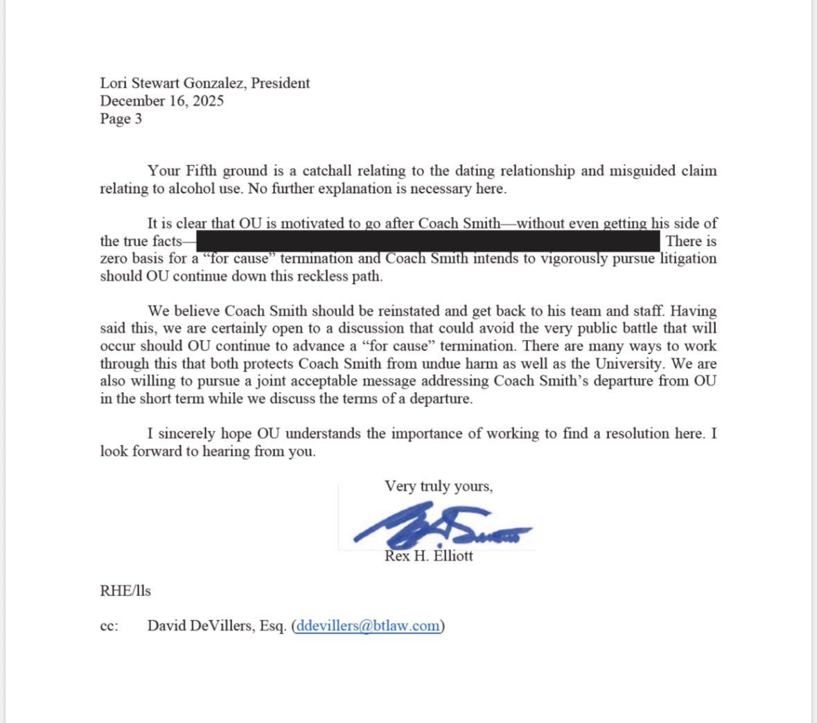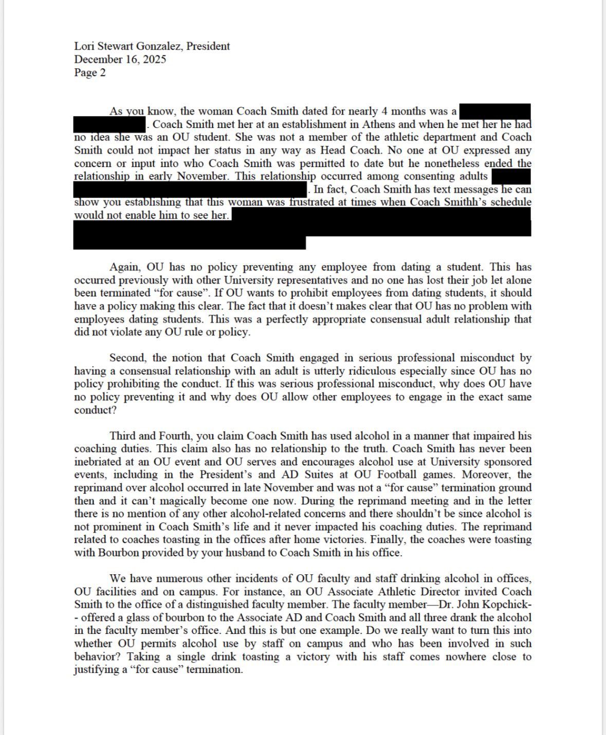 Smith's legal team goes on to note that there is no policy at OU against employees dating a student, and thus does not justify a "for cause" termination.