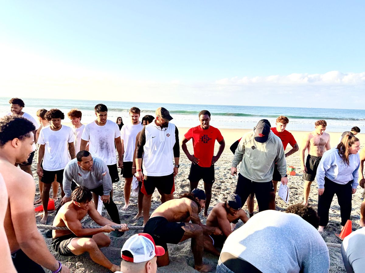 With the regal Hotel del Coronado a few hundred yards south of their spot and along same shores that United States Navy SEALs candidates are preparing for ‘Hell Week,’ San Diego State’s 2026 football team, the program’s third under Lewis and replete with eight returning starters on offense and 10 defensive players who logged at least 200 snaps last season, is building a concrete foundation of toughness here in the sand.