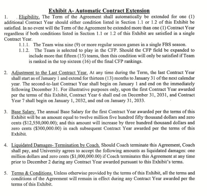 Elko will trigger an automatic 1-year extension each time he wins nine regular season games or reaches the College Football Playoff. If/when that happens, Elko's 2032 salary would be $12.55 million and continue the annual $300,000 raises from there. He would owe a $1 million buyout if he left prior to Dec. 2 under Exhibit A.